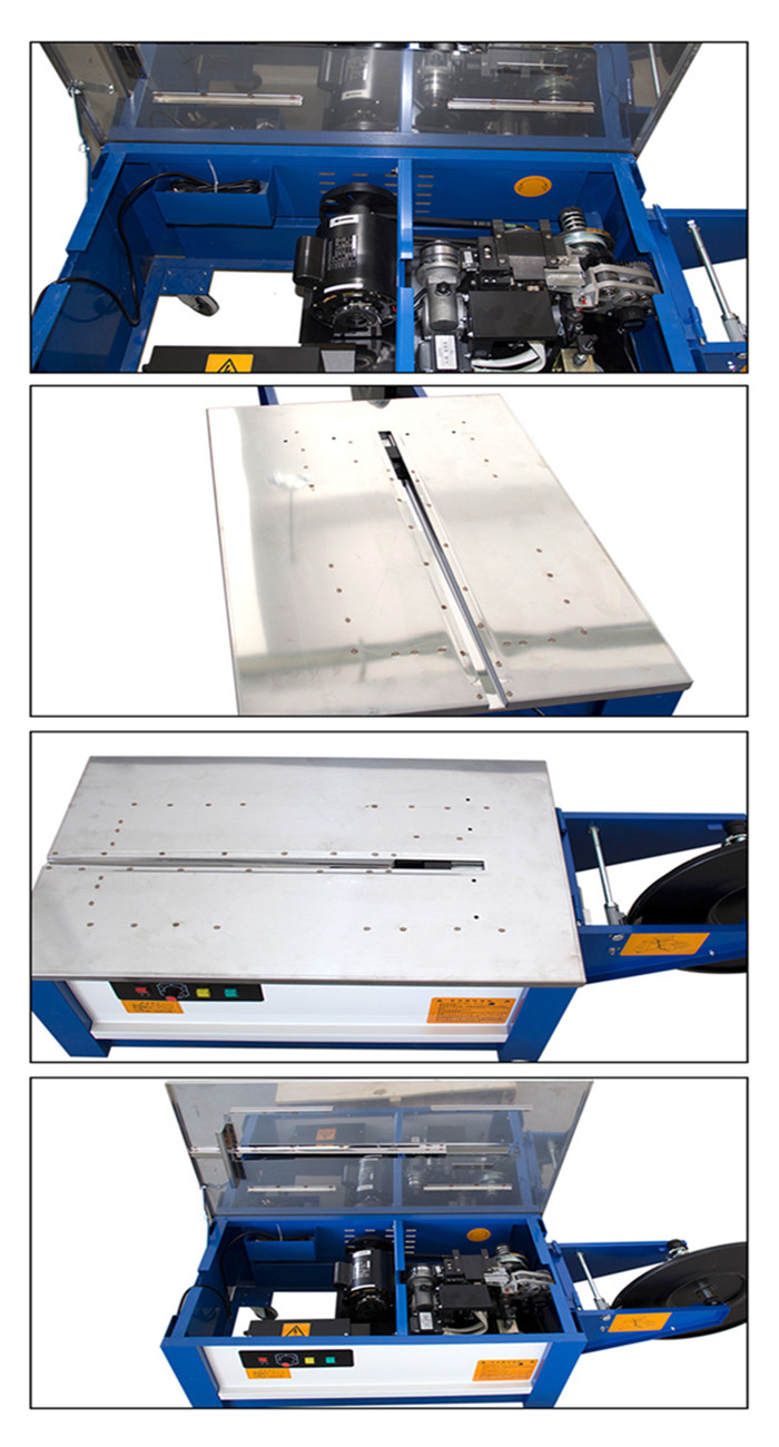 ◆打包機的用途 打包機是以聚乙烯塑料帶為捆扎材料,主要用于商業、郵政、鐵路、銀行、食品、醫藥、書刊發行等行業的紙箱、紙包件、柳編箱、布包件的包裝捆扎。 ◆打包機的工作原理 在插入包裝帶后,機器能自動完成聚帶、熱合、切斷、并出帶的捆扎過程;且有自動停機之功能;打包機是使用打包帶纏繞產品或包裝件,然后收緊并將兩端通過熱效應熔融或使用包扣等材料連接的機器,其工作速度快、效率高、省時省力、捆扎質量高。保證包件在運輸、貯存中不因捆扎不牢而散落,同時還應捆扎整齊美觀。 ◆打包機的特點 1、分離式上下滑板(相對一體式,故障率下降60%) 2、分離式出收帶輪(出帶輪組與收帶輪組是分開,直觀明了,相對一體式,故障率下降60%) 3、切刀更科學:V型切口,效果更好,壽命更長 4、外調松緊裝置,人手調整時松緊力時避免與機芯發生接觸而發生工傷事件 ◆打包機的工作流程 帶子送到位→收到捆扎信號→制動器放開,主電機啟動→右頂刀上升,頂住右帶于滑板處→“T”型導板后退→接近開關感應到退帶探頭→主電機停轉,制動器吸合→打包機退帶電機轉動,退帶0.35秒→帶子收緊捆在物體上→主電機二次啟動,制動器吸合→大擺桿二次拉帶,收緊帶子→左頂體上升,壓緊下層帶子→加熱片伸進兩帶子中間→中頂刀上升,切斷帶子→中頂刀下降→中頂刀再次上升,使兩帶子牢固粘合→中頂刀下降,左右頂刀同時下降→加熱片復位→滑板后退→“T”型導板復位→接近開關感應到送帶探頭→送帶電機啟動,帶動帶子送帶→大擺桿復位→帶子到位,帶頭頂到“T”型導板上接近開關感應到雙探頭→主電機停轉,剎車吸合→打包機完成一個工作循環。 ◆打包機的參數